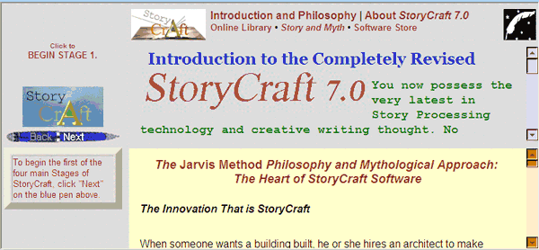 The brochure on this page illustrates some of the main pages and parts of the StoryCraft Software program. Using the program, you can easily write your stories in you favorite word-processing program, all the while being guided, cajoled, and inspired by advice that adapts to the particular story you're writing. And it's as easy to use as this very webpage — direct, straight-forward, and overflowing with the full range of story creation and development.